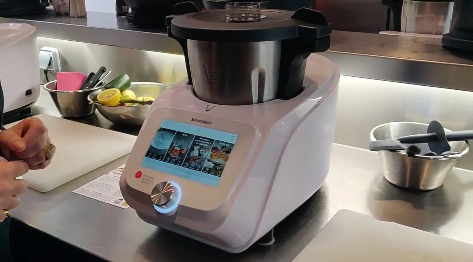 Le successeur du Monsieur Cuisine Plus propose plusieurs caractéristiques techniques que le petit robot cuiseur ne possédait pas. Il lui a ajouté la connexion wi-fi , un écran de 7 pouces, un bol de 4,5 litres (contenance utile de 3 L), la cuisine guidée via l’écran tactile, une balance intégrée. Très clairement, le robot Silvercrest a passé un cap technologique qui lui a permis de venir jouer dans la cour des grands.