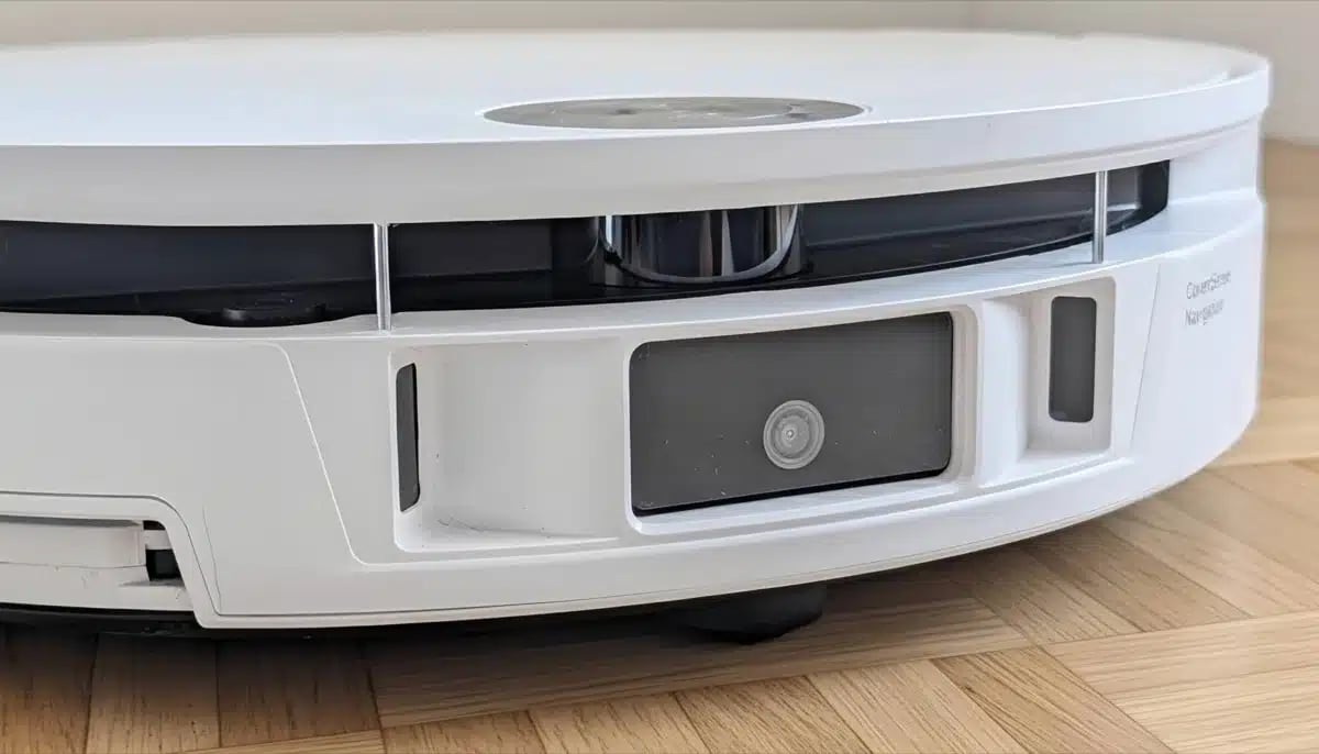 Pour se diriger dans la maison, l’appareil ne peut s’appuyer que sur un capteur dToF (direct time of flight) niché à l’avant du robot. Pas de LiDAR donc tels que l’on en croise régulièrement sur la plupart des modèles, bien à l’abri dans une tourelle sur le capot. Une astuce qui permet à l’appareil de ne mesurer que 9 cm de haut pour se faufiler sous les meubles bas. Mais elle a une contrepartie. Ce capteur n’offre pas un champ de « vision » très large au robot. En conséquence, il passe beaucoup de temps à tourner sur lui-même pour établir sa position, même en cours de fonctionnement…